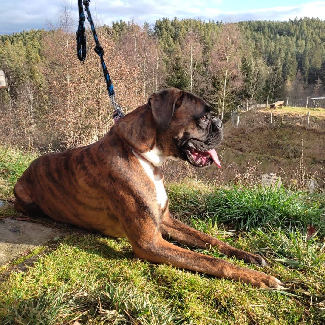 Fotografie k tomuto článku už mám schované hezky dlouho. Stále však nebyl čas článek napsat, a poté, co jsem přišla o svého bláznivého skoro ročního boxerka Rikouška, nebyla ani síla. Přece jen to byl první větší výlet, kde jsem vzala Rikouška do hradního areálu, aby se socializoval mezi více lidmi. Zvládnul to skvěle, i když mě v rozmoklém terénu párkrát stáhl tak šikovně, že jsem se jednou svezla blátem po zadku a jednou po kolenou. Také mi dodnes zní v uších věta, kterou někdo pronesl, když jsme si s dětmi a kamarádkou dávali svačinku a kávu, a Riky na nás poslušně čekal a shlížel na hradní zdi - "Tady je nějaké nádherné zvíře."